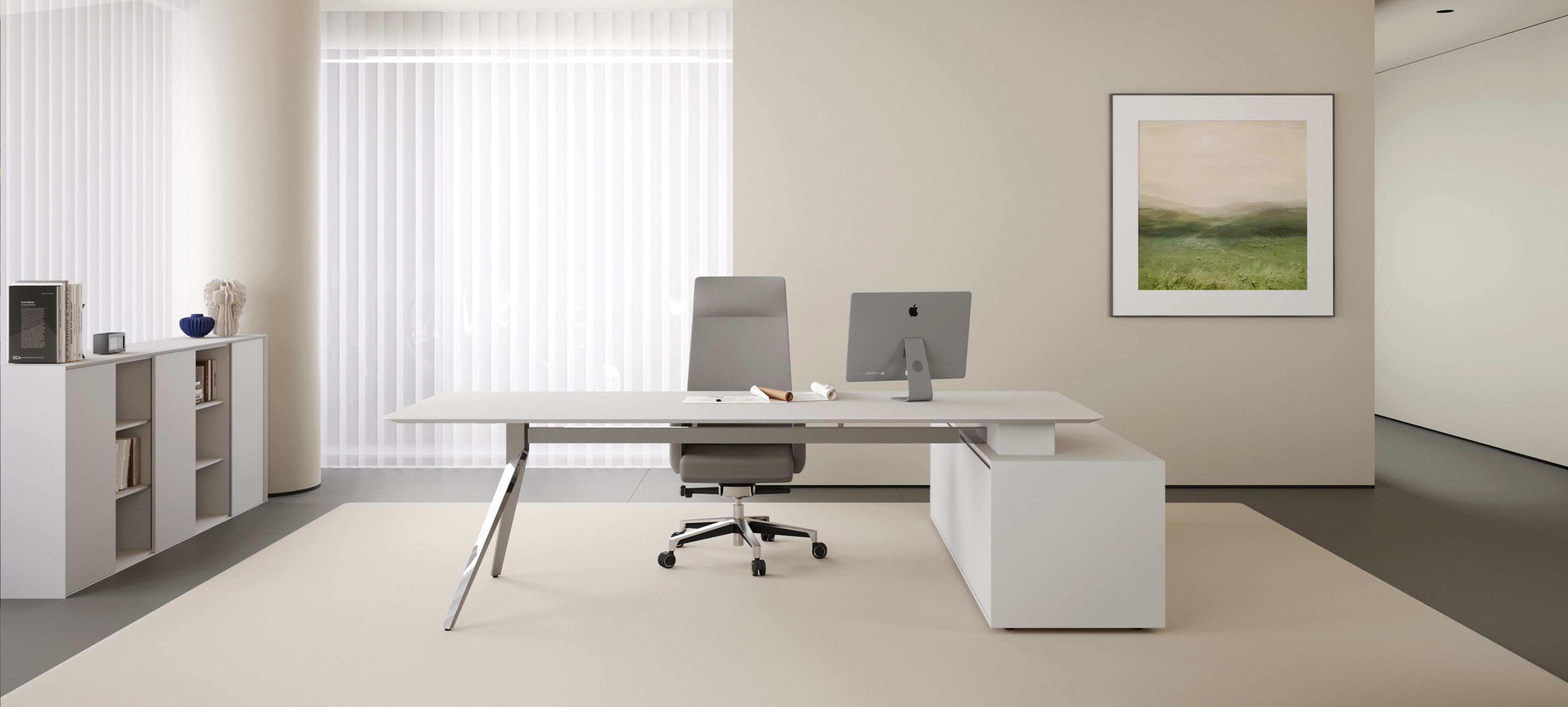 睿系列在外形上表達(dá)了干凈直挺的線條造型,實心壓鑄的臺腳賦予了它產(chǎn)品穩(wěn)定的厚重感。臺腳的表面電鍍工藝處理,體現(xiàn)了產(chǎn)品的高級感。臺面板四邊的斜面邊型處理,緩解了使用者長時間辦公帶來的手臂支撐的力度。隱藏式走線摒棄了所有繁瑣的支節(jié),單螺絲安裝便捷新穎,結(jié)構(gòu)穩(wěn)定。